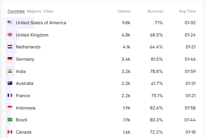 Countries are interesting to look at - USA is expectedly at the top, and UK, but it's cool to see Netherlands and Germany so high up too. Pushing Australia down under India.