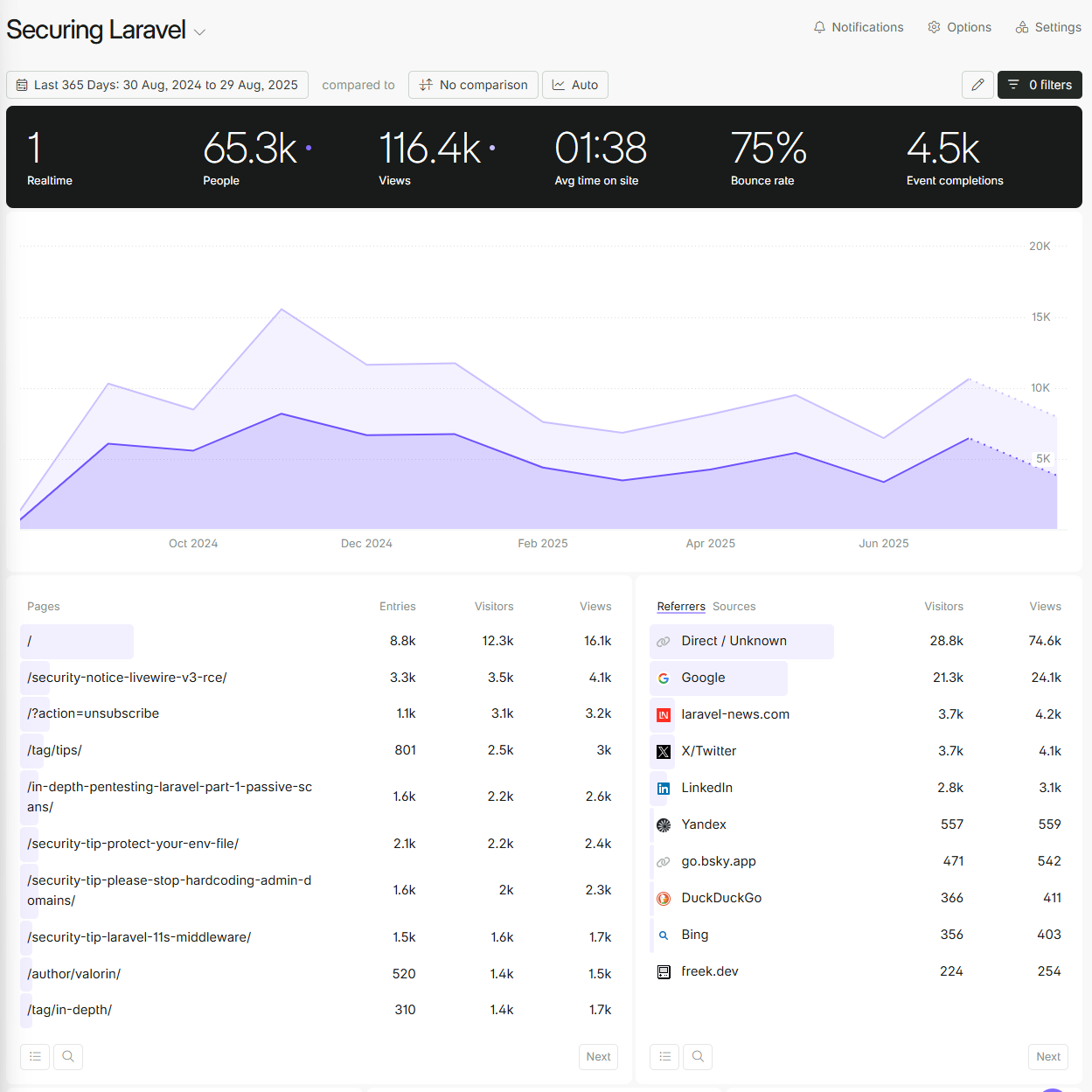 It's nice to see Laravel News sitting so high on the Referrers list, beating out Twitter. LinkedIn also has a good showing. Oh and Freek deserves a shoutout for driving traffic this way too!