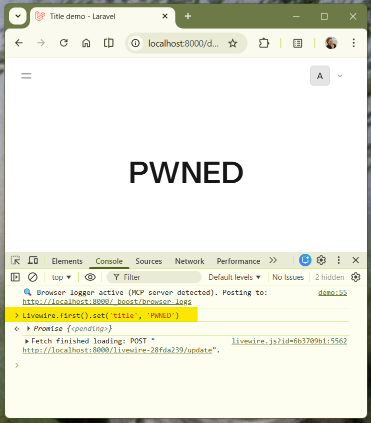 Livewire.first().set('title', 'PWNED')
