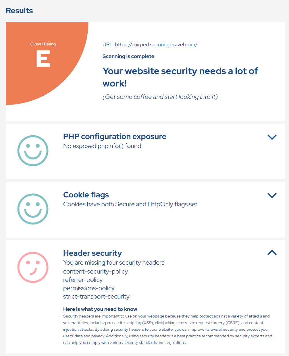 I've been asked many times about the process I follow when performing a Laravel Security Audit and Penetration Test. While I could have written up a lifeless checklist, I thought it would be far more interesting to walk you through my entire process, step-by-step, in a series of In Depth posts. We'll be using Chirper from the Laravel Bootcamp as a starting point, although I've introduced a couple of vulnerabilities and misconfigurations for us to find along the way. (Because doing this with a secure application would be boring!)