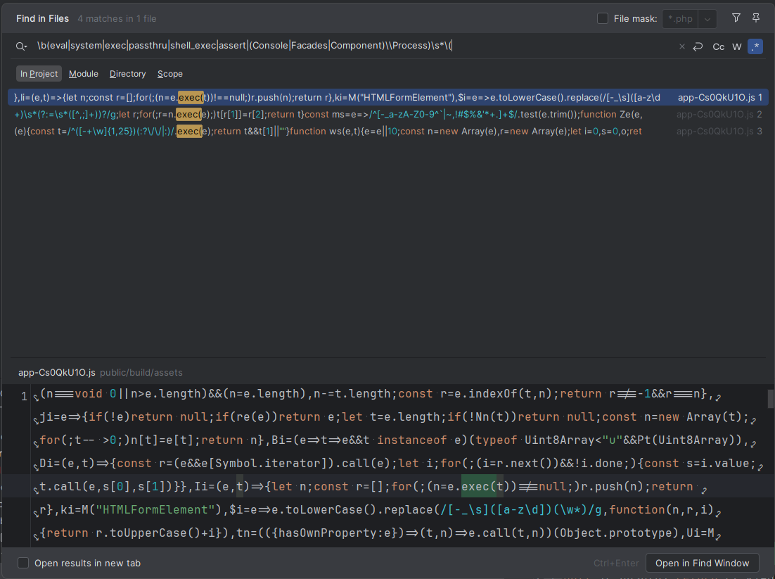 \b(eval|system|exec|passthru|shell_exec|assert|(Console|Facades|Component)\\Process)\s*\(Here it is in PhpStorm:
