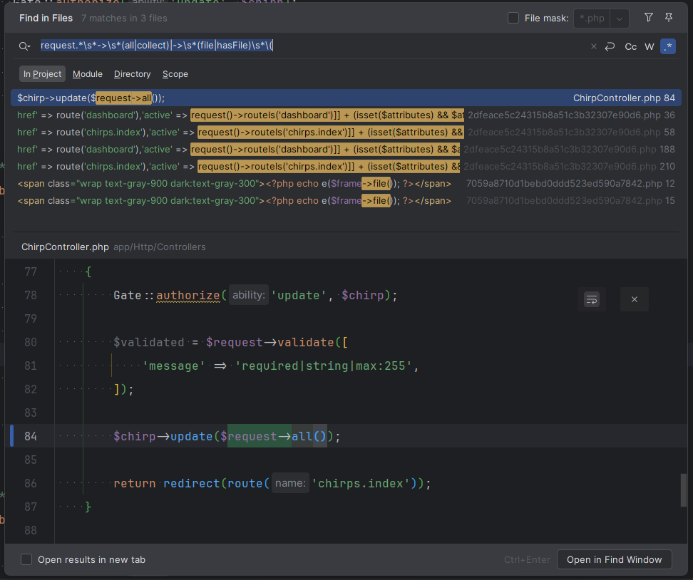 request.*\s*->\s*(all|collect)|->\s*(file|hasFile)\s*\(Running this against Chirped gives us this:
