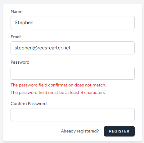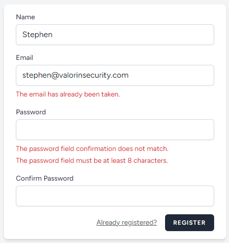 ]);As you’d expect, the unique rule ensures that the email address the user enters isn’t already in the database. This means that if you provide an email address for an existing user, the validation rule will reject the request and tell you a user account already exists.