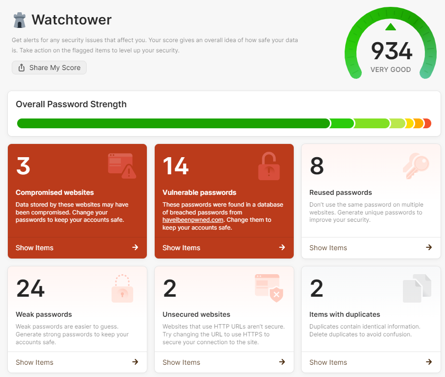For example, here’s my 1Password Watchtower report: