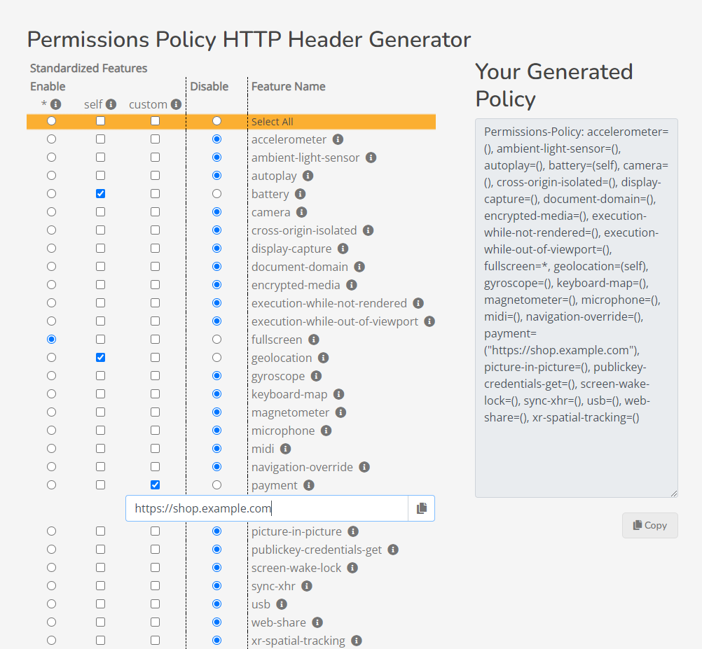 Permissions-Policy: accelerometer=(), ambient-light-sensor=(), autoplay=(), battery=(self), camera=(), cross-origin-isolated=(), display-capture=(), document-domain=(), encrypted-media=(), execution-while-not-rendered=(), execution-while-out-of-viewport=(), fullscreen=*, geolocation=(self), gyroscope=(), keyboard-map=(), magnetometer=(), microphone=(), midi=(), navigation-override=(), payment=("https://shop.example.com"), picture-in-picture=(), publickey-credentials-get=(), screen-wake-lock=(), sync-xhr=(), usb=(), web-share=(), xr-spatial-tracking=()Throw that in your app headers, and you'll have a permissions policy.