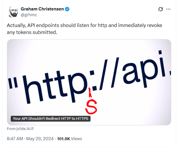 [Tip #123] If an API client tries to connect via unencrypted HTTP, what should your API do: redirect to HTTPS, disable HTTP, offer a swift rebuke, or take matters into it's own hands?