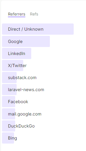 For example, here's the top referrers list from Securing Laravel's Fathom Analytics: