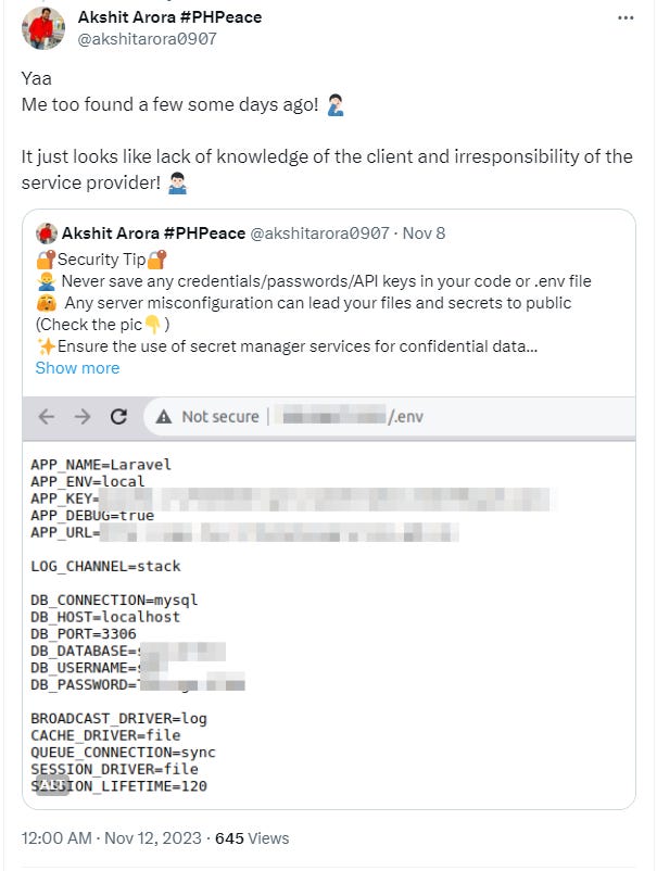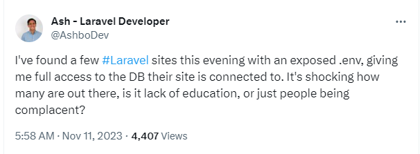 “I've found a few #Laravel sites this evening with an exposed .env, giving me full access to the DB their site is connected to. It's shocking how many are out there, is it lack of education, or just people being complacent?” @AshboDev