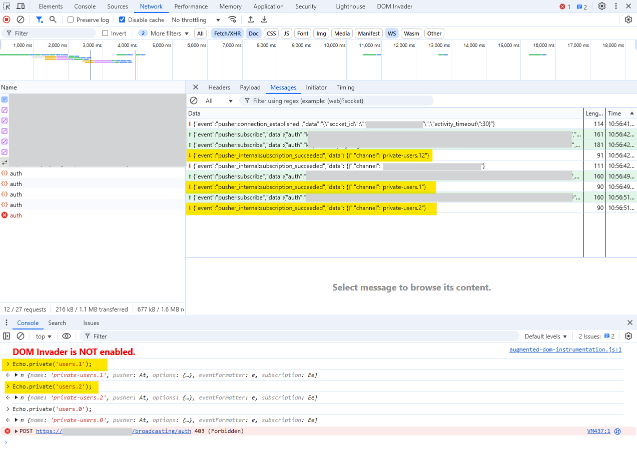 To subscribe to any other user's private channel, all I had to do was go into the browser console, type Echo.private('users.1');, and I'm in.